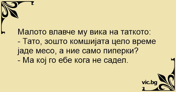 - Тато, зошто комшијата цело време јаде месо, а ние само пиперки?
