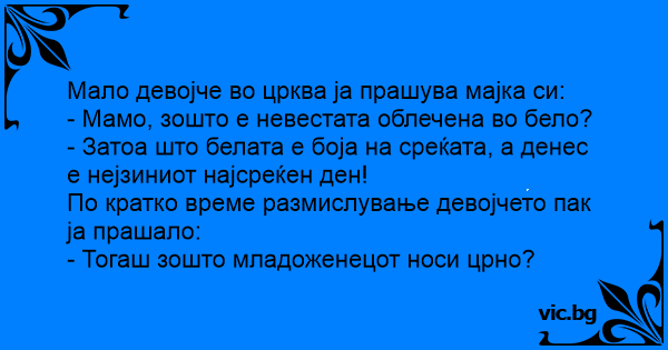Мамо, ги гледав сликите од вашата свадба со тато и сакам да те прашам зошто носиш бел фустан? Мајката: Зошто белата боја е боја на радоста. Детето: А тогаш зошто тато е во црно?!