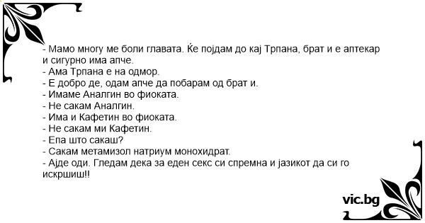 - Мамо мноry ме боли главата. Ќе појдам до кај Tрпана, брат и е аптекар и сигурно има апче.