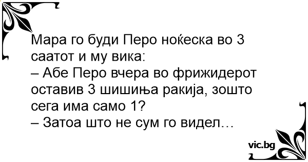 – Абе Перо вчера во фрижидерот оставив 3 шишиња ракија, зошто сега има само 1?