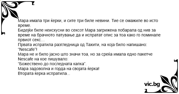 Бидејќи биле неискусни во сексот Мара загрижена побарала од нив за време на брачното патување да и испратат опис за тоа како го поминале првиот cekc…