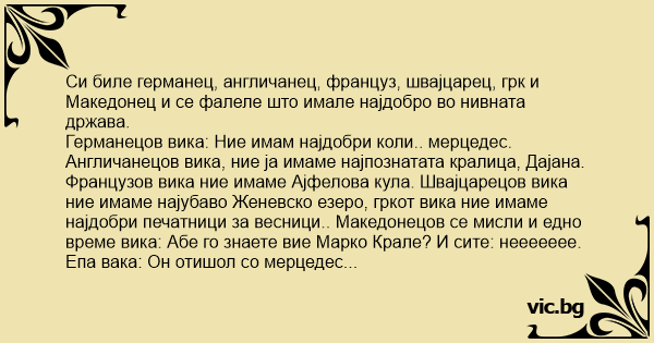 Германецов вика: Ние имам најдобри коли.. мерцедес. Англичанецов вика, ние ја имаме најпознатата кралица, Дајана. Французов вика ние имаме Ајфелова кула. Швајцарецов вика ние имаме најубаво Женевско езеро, гркот вика ние имаме најдобри печатници за весници.. Македонецов се мисли и едно време вика: Абе го знаете вие Марко Крале? И сите: неееееее.