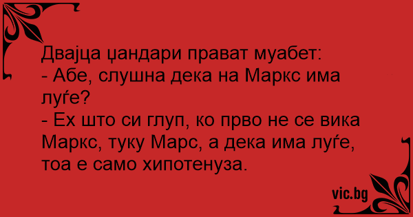 - Ех што си глуп, ко прво не се вика Маркс, туку Марс, а дека има луѓе, тоа е само хипотенуза.