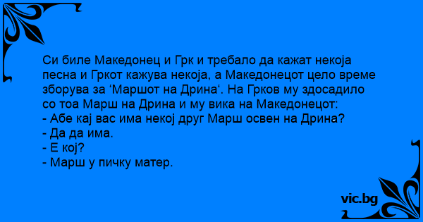 Си биле Македонец и Грк и требало да кажат некоја песна и Гркот кажува некоја, а Македонецот цело време зборува за ‘Маршот на Дрина‘. На Грков му здосадило со тоа Марш на Дрина и му вика на Македонецот: