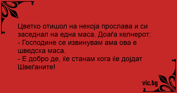 Цветко отишол на некоја прослава и си заседнал на една маса. Доаѓа келнерот: