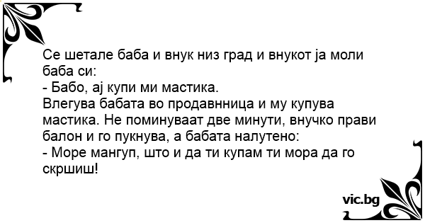 Влегува бабата во продавнница и му купува мастика. Не поминуваат две минути, внучко прави балон и го пукнува, а бабата налутено: