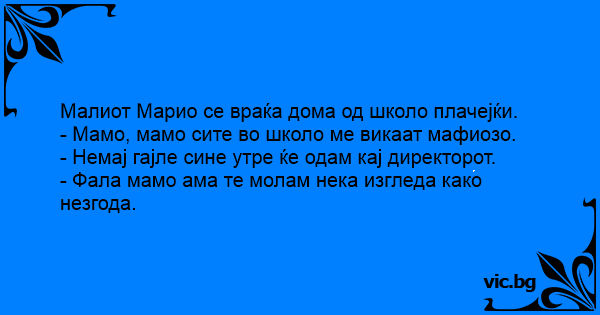 - Тато, тато, абе сите на школо ми велат дека сум бил мафија. - Ништо сине, утре ќе појдам кај директорот и ќе ја средам работата. - Добро тато, ама гледај да изгледа како несреќа.