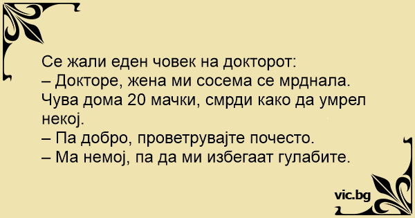 – Докторе, жена ми сосема се мрднала. Чува дома 20 мачки, смрди како да умрел некој.