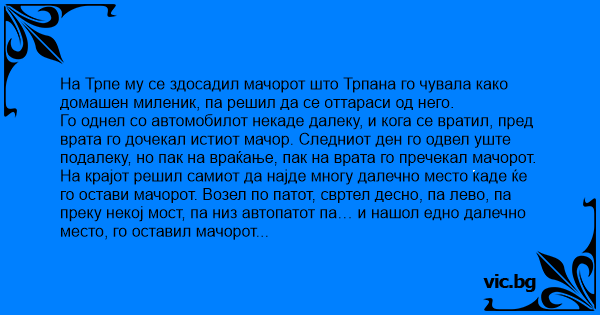 Го однел со автомобилот некаде далеку, и кога се вратил, пред врата го дочекал истиот мачор. Следниот ден го одвел уште подалеку, но пак на враќање, пак на врата го пречекал мачорот. На крајот решил самиот да најде многу далечно место каде ќе го остави мачорот. Возел по патот, свртел десно, па лево, па преку некој мост, па низ автопатот па… и нашол едно далечно место, го оставил мачорот и избегал. Пoдоцна не се вратил дома туку и се јавил на Трпана и ја прашал: