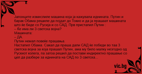 Јапонците измислиле машина која ја кажувала иднината. Путин и барак Обама решиле да појдат до Токио и да ја прашаат машината што ќе биде со Русија и со САД. Прв пристапил Путин :
