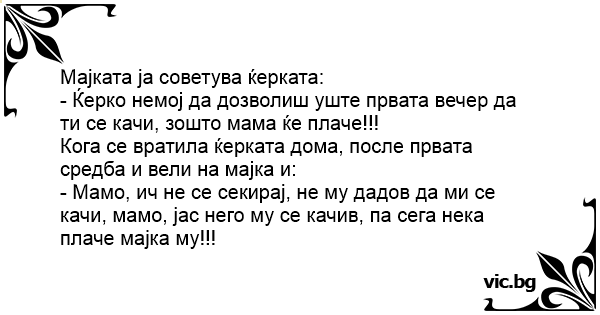 - Мамо, ич не се секирај, не му дадов да ми се качи, мамо, јас него му се качив, па сега нека плаче мајка му!!!