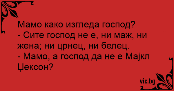 En lille dreng spørger sin far... - Far, er Gud en mand eller en kvinde? - Begge dele min dreng. - Far, er Gud sort eller hvid? - Begge dele min søn, begge dele. - Far, er Michael Jackson Gud?