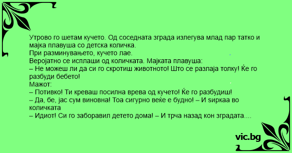 Утрово го шетам кучето. Од соседната зграда излегува млад пар татко и мајка плавуша со детска количка.