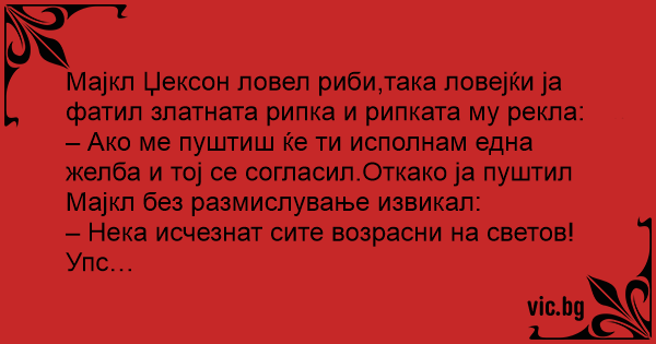 Мајкл Џексон ловел риби,така ловејќи ја фатил златната рипка и рипката му рекла: