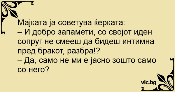 – И добро запамети, со својот иден сопруг не смееш да бидеш интимна пред бракот, разбра!?
