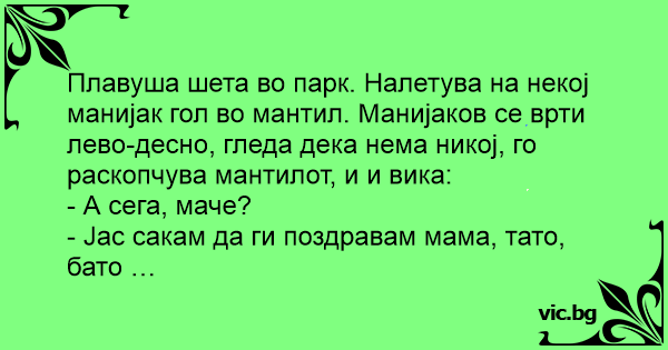 Плавуша шета во парк. Налетува на некој манијак гол во мантил. Манијаков се врти лево-десно, гледа дека нема никој, го раскопчува мантилот, и и вика: