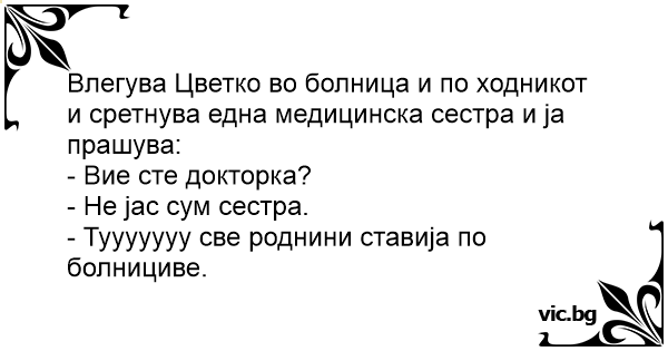 Влегува Цветко во болница и по ходникот и сретнува една медицинска сестра и ја прашува: