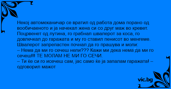 Поцрвенет од лутина, го грабнал швалерот за коса, го довлечкал до гаражата и му го ставил пенисот во менгеме. Швалерот запрепастен почнал да го прашува и моли: