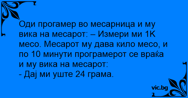 Оди прогамер во месарница и му вика на месарот: – Измери ми 1K месо. Месарот му дава кило месо, и по 10 минути програмерот се враќа и му вика на месарот: