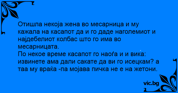 По некое време касапот го наоѓа и и вика: извинете ама дали сакате да ви го исецкам? а таа му враќа -па мојава пичka не е на жетони.