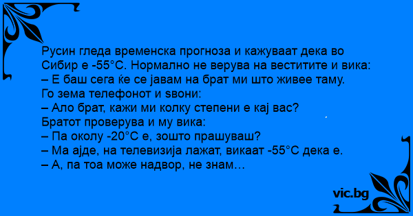 Русин гледа временска прогноза и кажуваат дека во Сибир е -55°C. Нормално не верува на веститите и вика: