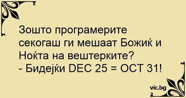 - Kodėl programuotojai kartais maišo Helovyną su Kalėdomis? - Nes Oct 31 lygu Dec 25.