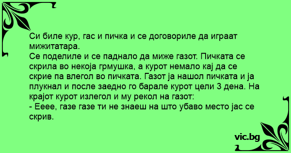 Се поделиле и се паднало да миже газот. Пичката се скрила во некоја грмушка, а курот немало кај да се скрие па влeгол во пичката. Газот ја нашол пичката и ја плукнал и после заедно го барале курот цели 3 дена. На крајот курот излегол и му рекол на газот: