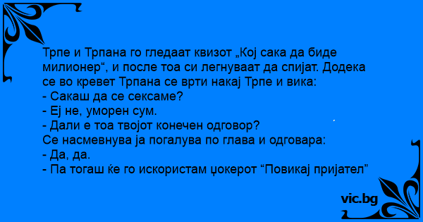 Трпе и Трпана го гледаат квизот „Кој сака да биде милионер“, и после тоа си легнуваат да спијат. Додека се во кревет Трпана се врти накај Трпе и вика: