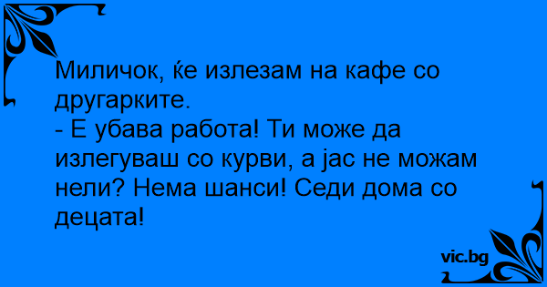 - Е убава работа! Ти може да излегуваш со kуpbи, а јас не можам нели? Нема шанси! Седи дома со децата!