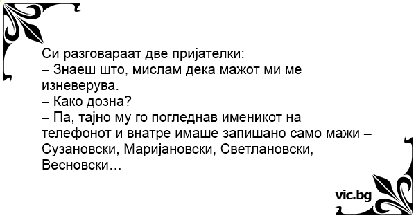 – Па, тајно му го погледнав именикот на телефонот и внатре имаше запишано само мажи – Сузановски, Маријановски, Светлановски, Весновски…