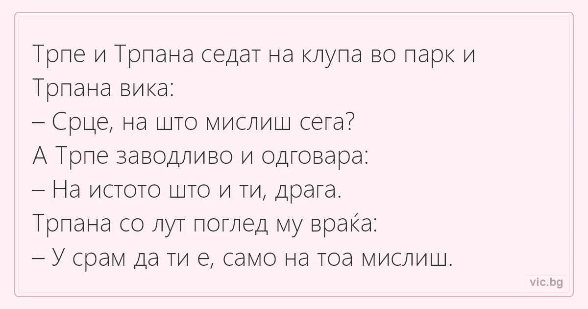 Трпе и Трпана седат на клупа во парк и Трпана вика:<br />– Срце, на што мислиш сега?<br />А Трпе заводливо и одговара:<br />– На истото што и ти, драга.<br />Трпана со лут поглед му враќа:<br />– У срам да ти е, само на тоа мислиш.