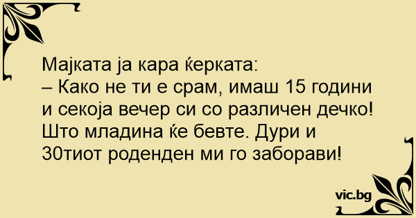 – Како не ти е срам, имаш 15 години и секоја вечер си со различен дечко! Што младина ќе бевте. Дури и 30тиот роденден ми го заборави!