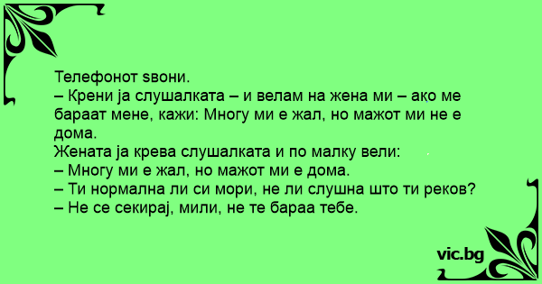 – Крени ја слушалката – и велам на жена ми – ако ме бараат мене, кажи: Многу ми е жал, но мажот ми не е дома.