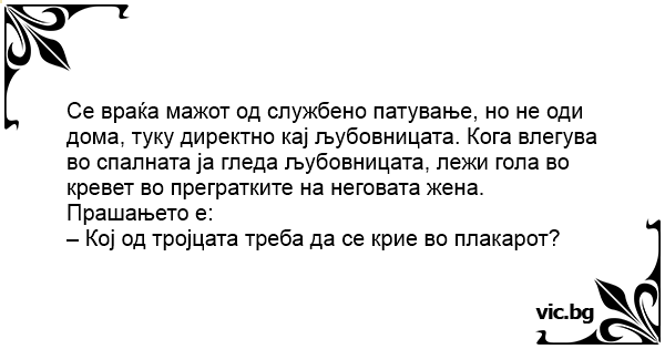 Се враќа мажот од службено патување, но не оди дома, туку директно кај љубовницата. Кога влегува во спалната ја гледа љубовницата, лежи гола во кревет во прегратките на неговата жена.<br />Прашањето е:<br />– Кој од тројцата треба да се крие во плакарот?