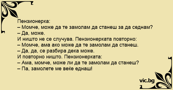 Пензионерка: – Момче, може да те замолам да станеш за да седнам? – Да, може. И ништо не се случува. Пензионерката повторно: – Момче, ама ако може да те замолам да станеш. – Да, да, се разбира дека може. И повторно ништо. Пензионерката: – Ама, момче, може ли да те замолам да станеш? – Па, замолете ме веќе еднаш!
