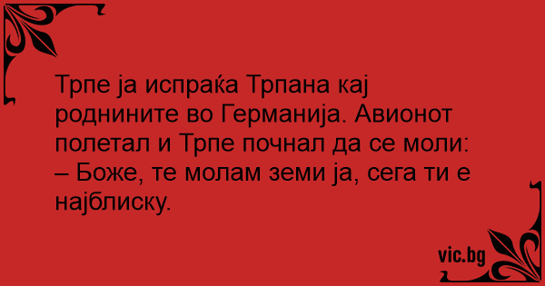Трпе ја испраќа Трпана кај роднините во Германија. Авионот полетал и Трпе почнал да се моли: