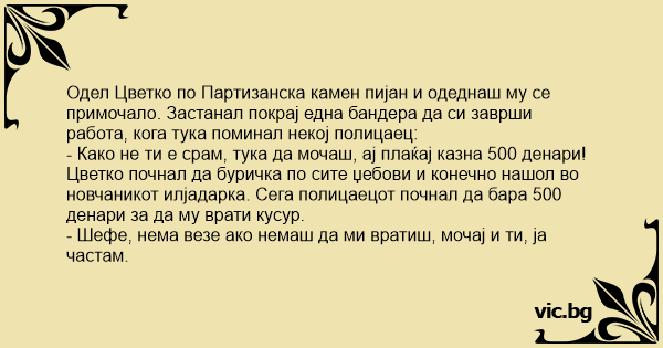Цветко почнал да буричка по сите џебови и конечно нашол во новчаникот илјадарка. Сега полицаецот почнал да бара 500 денари за да му врати кусур.