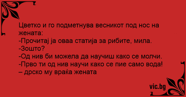 -Прво ти од нив научи како се пие само вода! – дрско му враќа жената