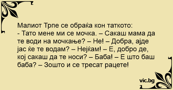 - Тато мене ми се мочка. – Сакаш мама да те води на мочкање? – Не! – Добра, ајде јас ќе те водам? – Нејќам! – Е, добро де, кој сакаш да те носи? – Баба! – Е што баш баба? – Зошто и се тресат рацете!