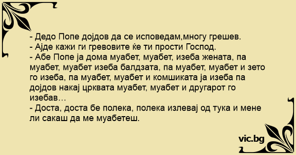- Абе Попе ја дома муабет, муабет, изеба жената, па муабет, муабет изеба балдзата, па муабет, муабет и зето го изеба, па муабет, муабет и комшиката ја изеба па дојдов накај црквата муабет, муабет и другарот го изебав…