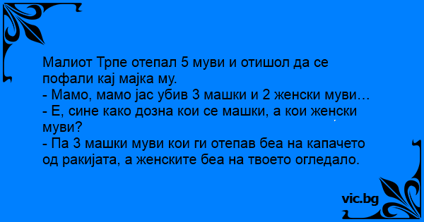 Жената влегува во кујна и го начекува мажот како стои со тепалка за муви во рацете и шета низ кујната. Што правиш? Тепам муви. Па утепа ли некоја? Да, пет машки три женски. Жената изнервирана: А...