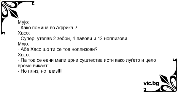 Großwildjäger am prahlen Τα ... νομιστεράκια Το σαφάρι και ο πόντιος Τα νομιστερακια.... Отиват американец, французин и българин на сафари в Африка. Провежда се състезание между ловци. Drei Buschjäger unterhalten sich. Sagt der erste: "Bei der letzten Treibjagd habe ich vier Hirsche und drei Notmes geschossen. " C'est un gars qui en revenant de la chasse de la jungle dit à son ami : Man stelle sich einen Safari-Club in Kenia vor, indem vor allem versnobte Großwildjäger verkehren. Abends sitzen diese Herren im Club beisammen un erzählen sich ihre Erlebnisse des Tages. Wraca blondynka z Safari i chwali sie swojej znajomej: - Upolowalam lwa, słonia, dwie zebry, żyrafe i z pół tuzina "noplisów"... - A co to takiego te "noplisy"? - Takie małe, czarne, biega przed lufa i krzyczy "No Please, no please..." Трима нашенци отишли на ловно сафари в Африка. Вечерта на първия ден почнали да се хвалят край лагерния огън: - Аз свалих лъв! - Аз пък ударих носорог! - Аз убих едно номистераки - казал третият.... - Je suis allé à la chasse aujourd'hui ! - Ah ouais ? Et tu as pris quoi ? - J'ai pris 2 lapins, 3 oiseaux, et 5 pânous ! - Des pânous ? C'est quoi ça ? - Je ne sais pas, j'était trop loin pour les... Конкурс охотников в Африке. Стрелять можно все, кроме крокодилов. Очевидные лидеры Американец, Англичанин и Чукча. * 1-й день. Американец: 2 бегемота. Англичанин: 3 слона. Чукча: 5 ноусеров.... Een Nederlander, een Engelsman en een Belg gaan jagen; Na het verloop van de eerste dag zegt de Engelsman: "Ik heb vandaag 2 olifanten, 4 giraffen en 5 apen buitgemaakt." De Belg zegt: "Phoeh, ik... Grįžta naujasis rusas iš Afrikos. Draugai klausinėja kaip jam sekėsi medžioklė. Tas pasakoja: - Nušoviau 3 liūtus, 2 dramblius ir 8 nouplysus. Draugai klausia: - Kas tie nouplysai? Tas atsako: -... Az idős vadász meséli afrikai vadászélményeit. - Afrikában lőttem 10 zsiráfot, 6 elefántot és 4 noplizt. - Mit? - kérdezi a hallgatóság. - Nopliz-t, feleli a vadász, kicsi, fekete, felteszi a kezét... Ptají se lovce, co ulovil v Africe. „Tři tygry, pět antilop a deset nouplízáků.” „???” „Takový ty černý, zvedá to ruce a křičí: Nou, plííz!” A vadász hazatér Afrikából. Meséli az élményeit, miket lőtt. - Lőttem egy zsiráfot, 12 gorillát, 3 elefántot meg egy noplizt. - Mi az a nopliz?- kérdezik a gyerekek. - Hát olyan 160-180 cm magas,...