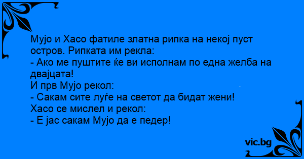 Мујо и Хасо фатиле златна рипка на некој пуст остров. Рипката им рекла: