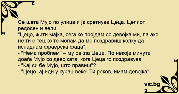 "Цецо, жити мајка, сега ќе пројдам со девојка ми, па ако не ти е тешко те молам да ме поздравиш колку да испаднам фраерска фаца".