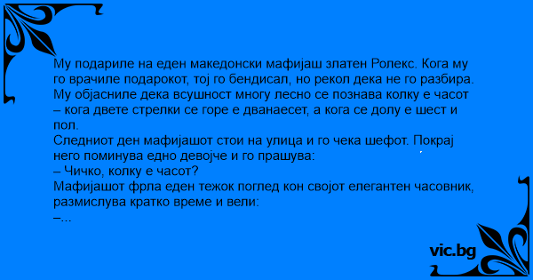 Му подариле на еден македонски мафијаш златен Ролекс. Кога му го врачиле подарокот, тој го бендисал, но рекол дека не го разбира.