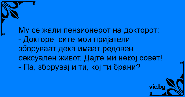 - Докторе, сите мои пријатели зборуваат дека имаат редовен cekcуaлeн живот. Дајте ми некој совет!