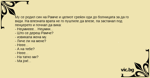 Му се родил син на Рамче и целиот среќен оди до болницата за да го види. На влезната врата не го пуштиле да влезе, па застанал под пенџерето и почнал да вика: