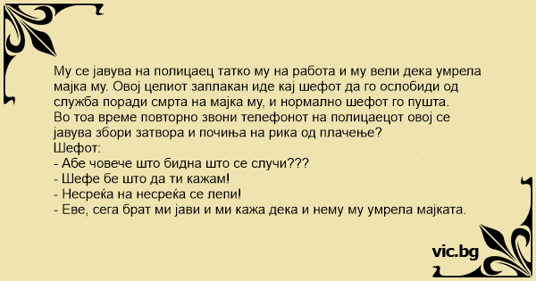 Му се јавува на полицаец татко му на работа и му вели дека умрела мајка му. Овој целиот заплакан иде кај шефот да го ослобиди од служба поради смрта на мајка му, и нормално шефот го пушта.