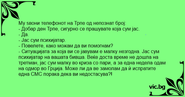 - Ситуацијата за која ви се јавувам е малку незгодна. Јас сум психијатар на вашата бивша. Веќе доста време не дошла на третман, јас сум малку во криза со пари, а за една недела одам на одмор во Грција. Може ли да ве замолам да ѝ испратите една СМС порака дека ви недостасува?!