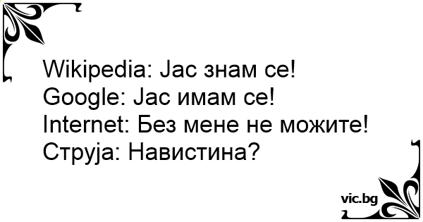 1. Wikipedia: Én mindent tudok! 2. Google: Nekem mindenem megvan! 3. Facebook: Én mindenkit ismerek! 4. Internet: Nélkülem ti nem értek semmit! Áramszolgáltató: Csakugyan? Wikipedia: - ¡Sé todo! Google: - ¡Puedo encontrar todo! Facebook: - ¡Conozco a tod@s! Internet: - ¡Sin mí no sois nada! Electricidad: - ¡Callaos, idiotas! Facebook: "Ich kenne jeden!" Wikipedia: "Ich weiß alles!" Google: "Ich finde alles!" Internet: "Ohne mich geht gar nichts!" Strom: "ACH WIRKLICH?" Wikipedia: I know everything! - Знам много неща! - каза Wikipedia. Wikipédia : Je sais tout ! Google : J'ai tout ! Facebook : Je connais tout le monde ! Internet : Pfff vous êtes rien sans moi ! Éléctricité : Hahaha j'vous ai tous ! Hádají se: Wikipedia: "Já vím všechno!" Google: "Já najdu všechno!" Facebook: "Já znám všechny!" Internet: ",,Beze mě jste všichni namydlení!" Elektřina: "A tak se uklidníme, jo?!" Wikipedia : Én mindent tudok! Google : Nálam mindent megtaláltok! Internet : Nélkülem nem értek semmit! Áram : Tényleg? Facebook: heč já znam všechny na světě! Google: a co, já znam všechno na světě!! Internet: hele vážení, beze mě byste byli v pr***! Elektřina: takže se uklidníme...